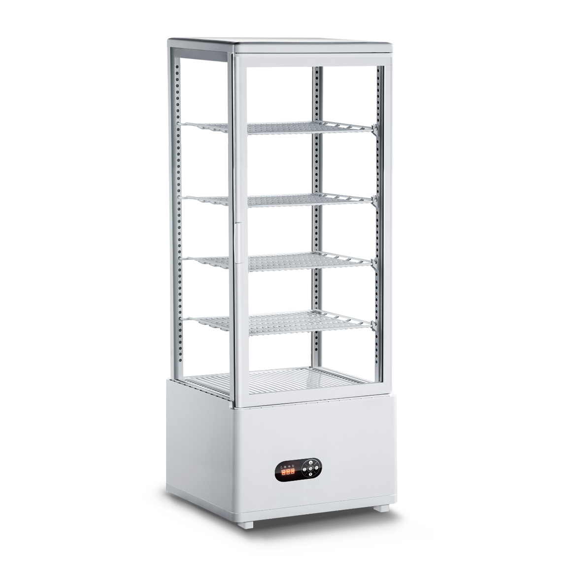 The GN-98L-WHITE is a compact and elegant vertical refrigerated display cabinet, which is the best solution for small-sized pastry shops, cafes and bistros. Its sophisticated white design easily fits into any interior, and the four-sided visibility allows the user to have a good look at the cakes, drinks or desserts on display.