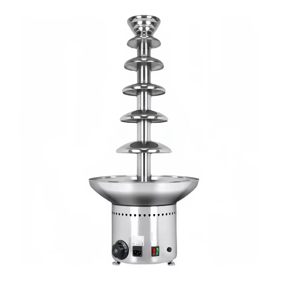 - Four-tier cascading design: Four (presumably) stainless steel tiers create a beautiful, cascading flow of chocolate, providing maximum visual impact and easy access for removing various products (fruit, marshmallows).