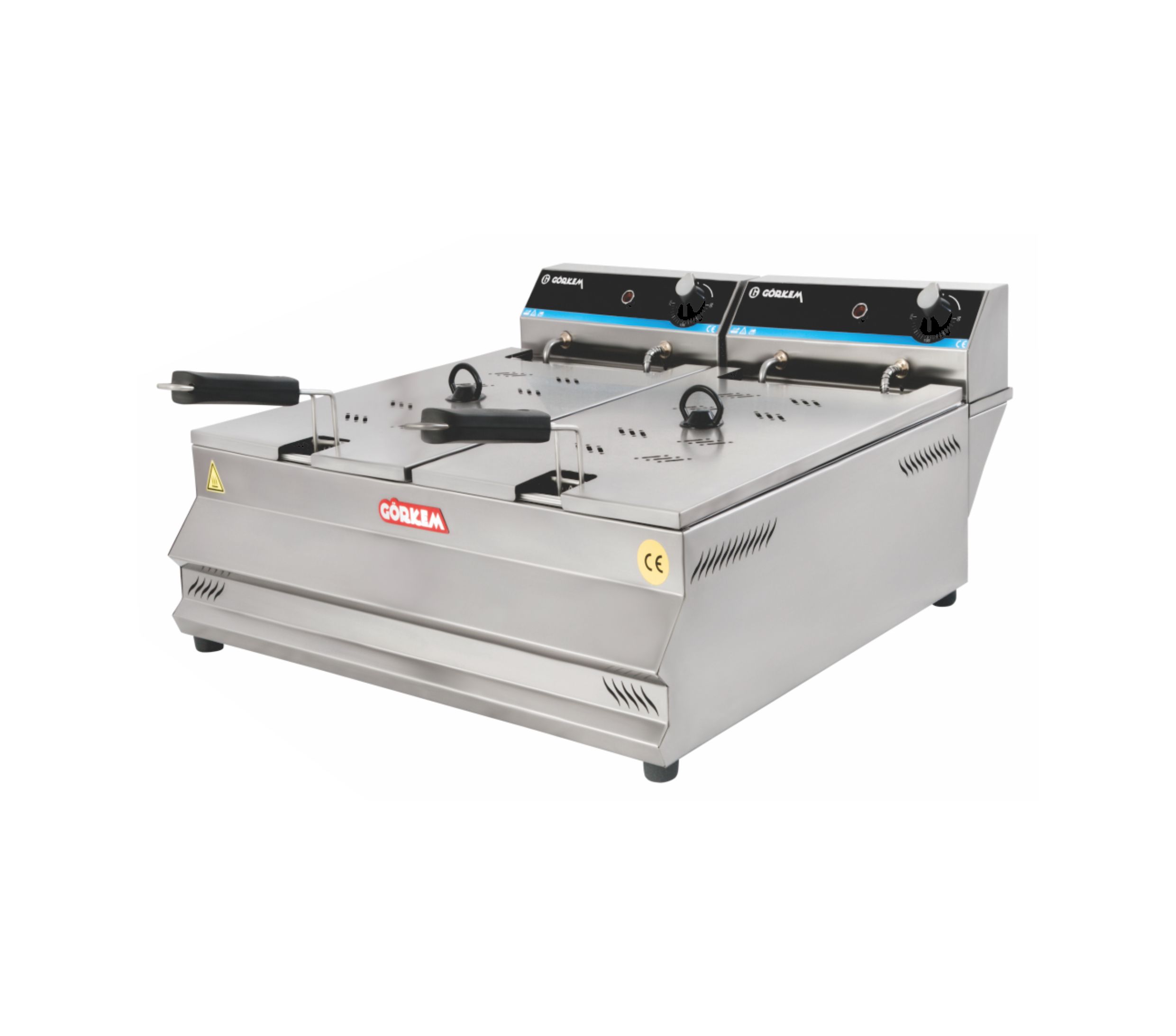 This high-capacity, double electric fryer from GÖRKEM is a central production unit for the busiest commercial kitchens. Its massive, total 20-liter capacity and powerful, 6-kilowatt heating system are designed for maximum performance, allowing for continuous cooking of large quantities of fried products.