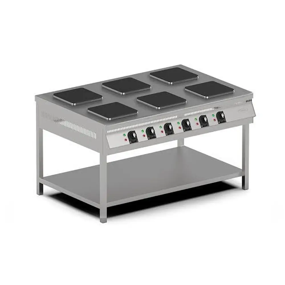 This CSA six-burner floor-standing electric stove represents an industrial-class appliance designed as the main production center for the largest and most demanding professional kitchens. Its massive 155 kg construction, enormous 150×100 cm work surface, and 24 kilowatt power are designed for continuous, high-volume culinary processes.