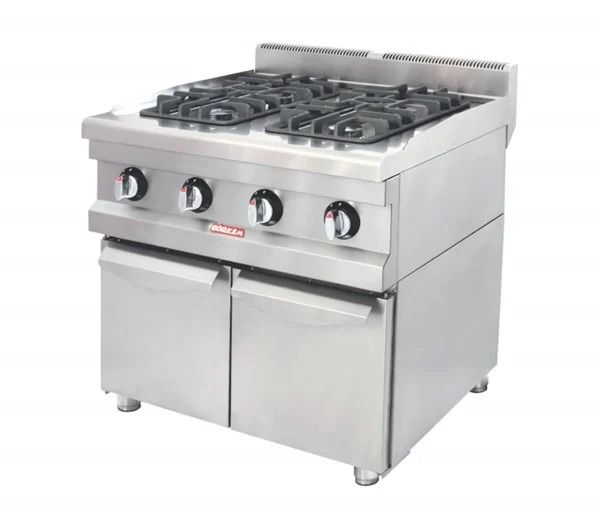 This four-burner, floor-standing gas cooker from AKGAZ is designed for maximum efficiency and space saving. Its compact, square design (80×80 cm) with four powerful burners and integrated lower cabinet provides the perfect, organized workspace for professional kitchens with limited space.