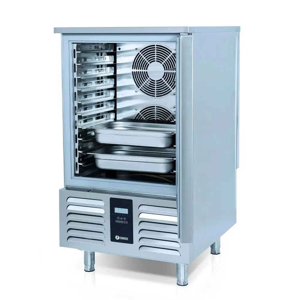The ICEINOX BLC-5 blast chiller is essential for facilities that work with large volumes of raw materials or finished products and require rapid conditioning or deep freezing to maintain quality.