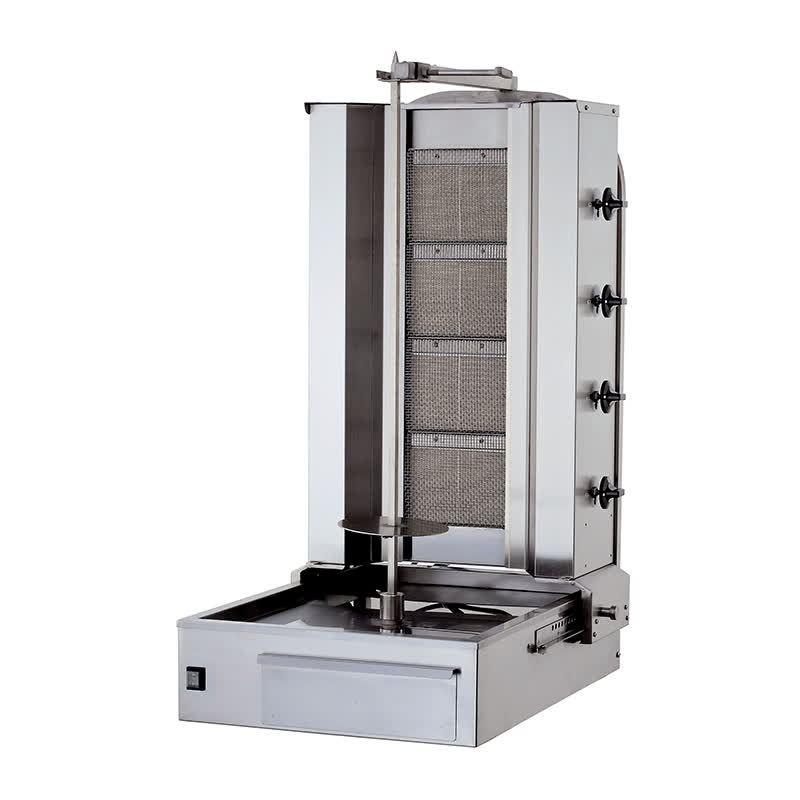 Вращающийся нижний двигатель отвечает за равномерное вращение мяса, что обеспечивает равномерную прожарку слоев – без избыточного пригорания и деформации. Четыре горелки регулируются отдельно, что позволяет оператору распределять мощность огня в зависимости от объема и типа продукта.