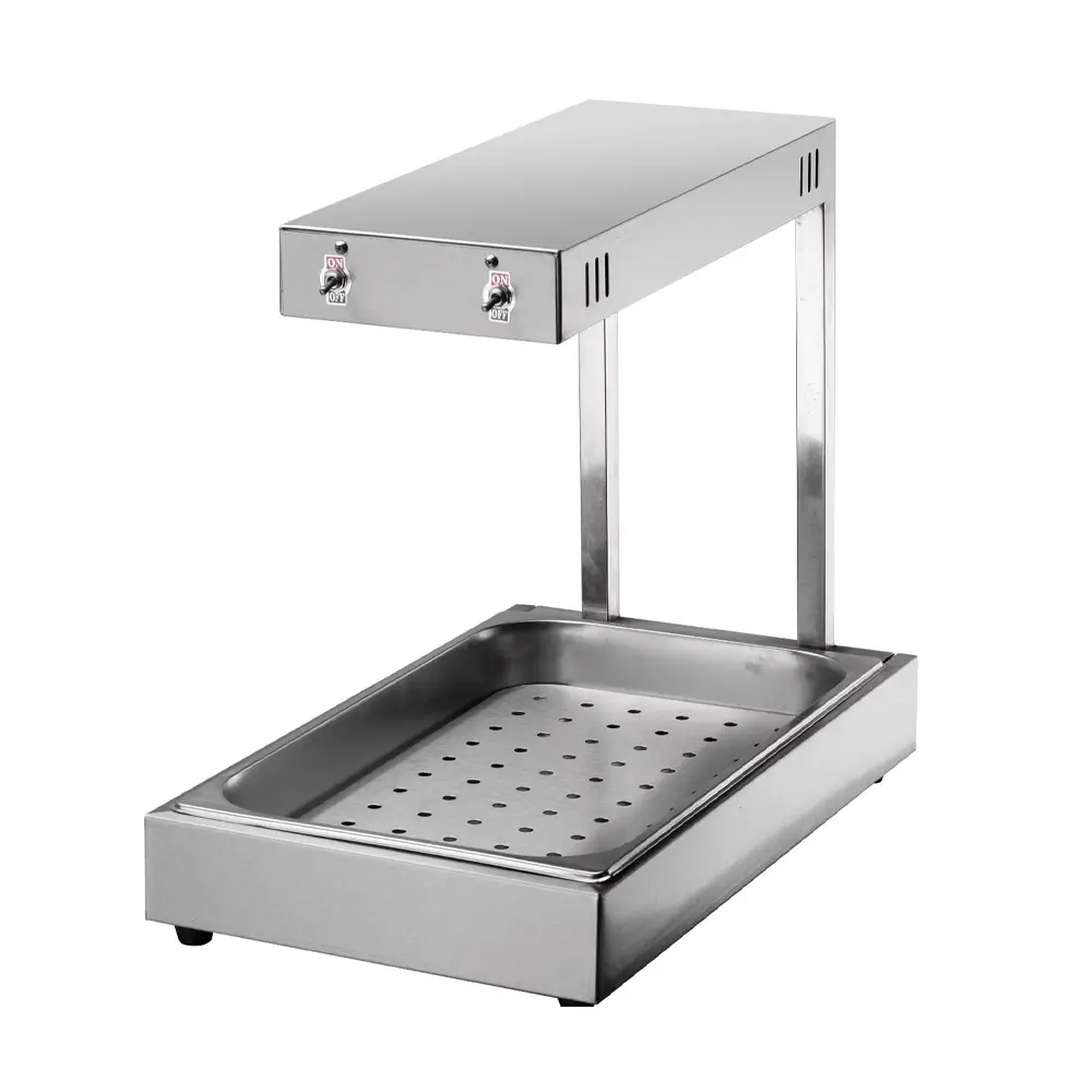 • Сохранение качества (тепло и хрустящая текстура): Устройство использует принцип двойного нагрева: специальная инфракрасная лампа сверху поддерживает тепло поверхности, а нижний нагревательный элемент обеспечивает общую температуру. Перфорированное дно удаляет лишний жир и защищает картофель от размокания.