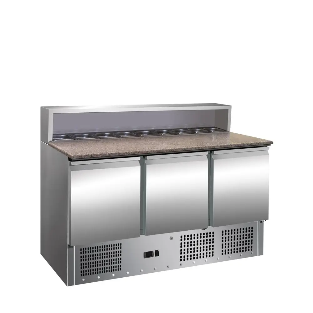 Холодильник для пиццерий PS-903 идеально подходит для ресторанов быстрого питания, пиццерий и профессиональных кухонь, где требуется организованное, гигиеничное и стабильное хранение ингредиентов. Устройство сочетает в себе рабочую поверхность, морозильную камеру и верхнюю секцию для контейнеров, что упрощает и ускоряет рабочий процесс.